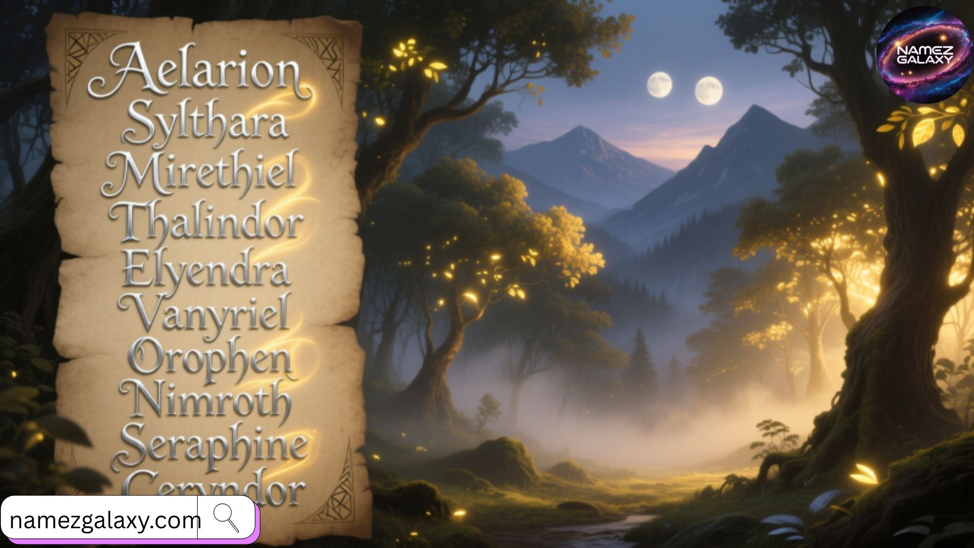 Regal male elf names include Thalion, Caelithar, Vaerion, and Eryndor, perfect for warriors, mages, or noble leaders.